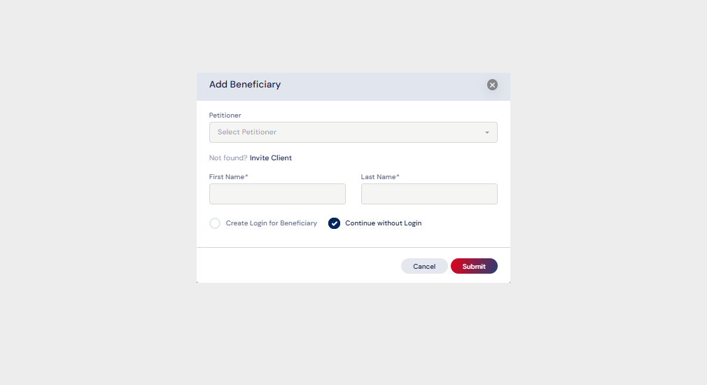 It is possible to invite a Beneficiary without requiring an account. When adding a Beneficiary who does not have an account, you only need to provide their First and Last Name after selecting the Petitioner.