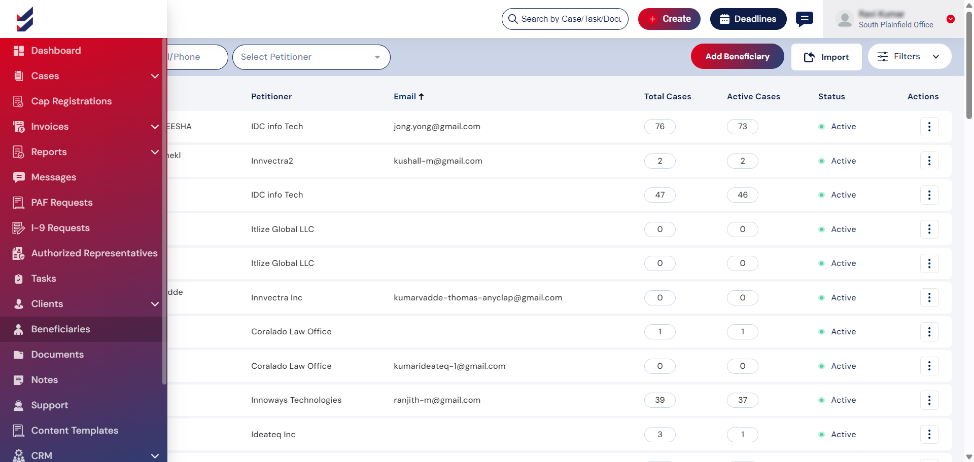 Access Beneficiaries:By default, a list of all Beneficiaries linked to your company will be shown, accompanied by essential information. By clicking on a specific record, you can expand the list to view all Active Cases associated with that Beneficiary. Selecting an individual case will direct you to the Case Details, where you can carry out actions related to the case.