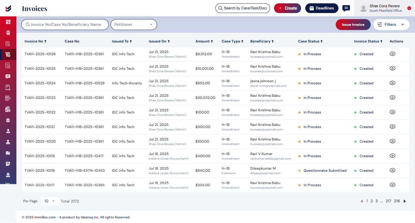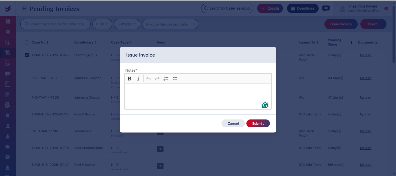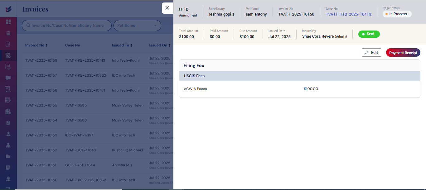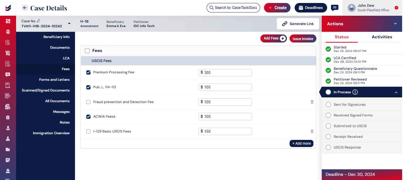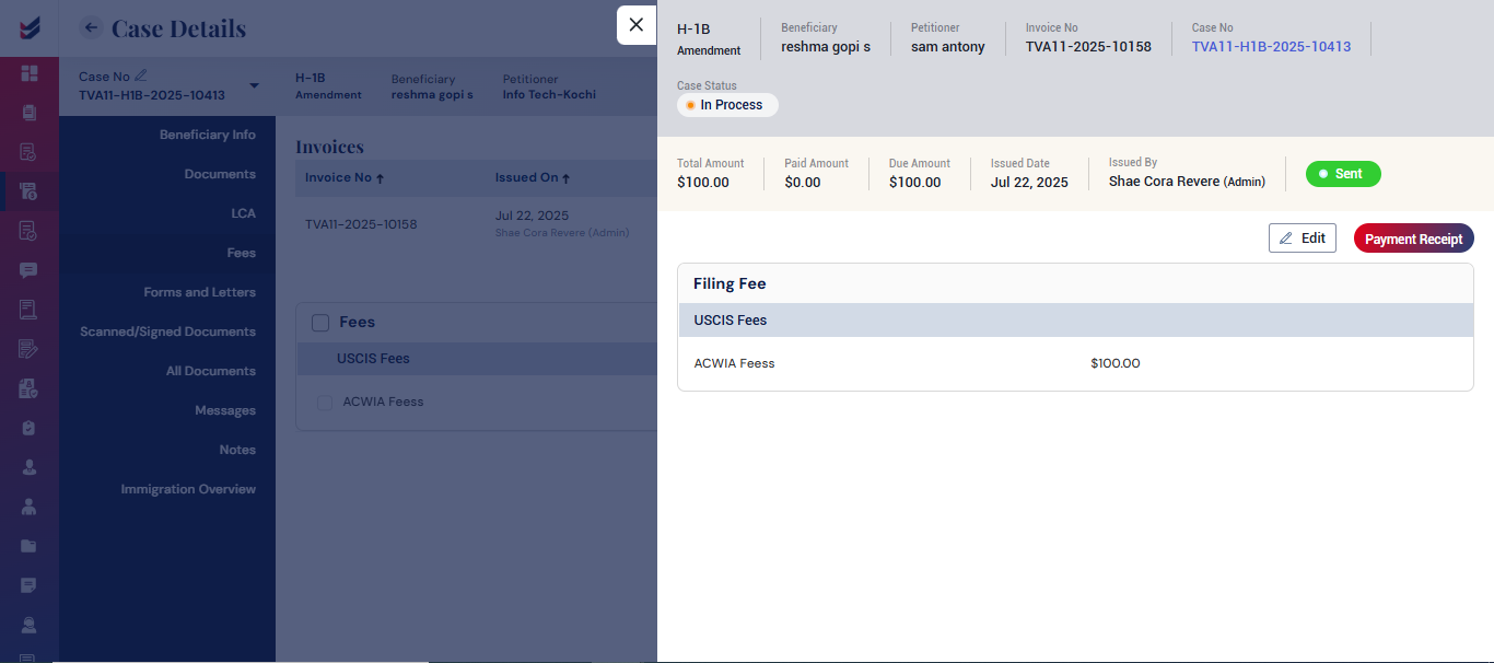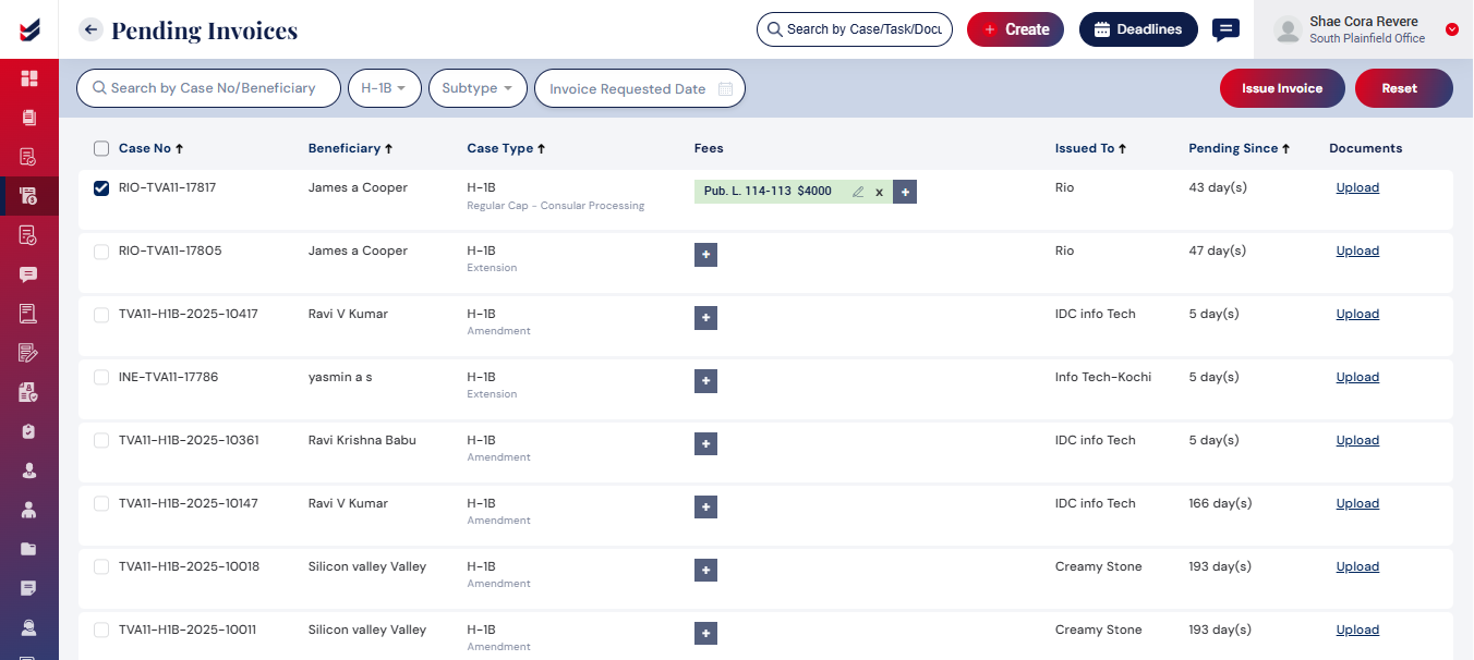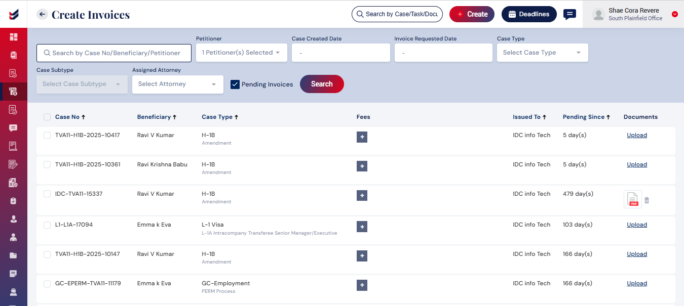 Invoices can be issued for cases by accessing ‘Create Invoice’ from Invoices section from the left navigation. We can search the cases to issue invoices using Case Number, Beneficiary and Petitioner Name and Case Type. Against each case, all applicable fees can be added under ‘Fees’ column.