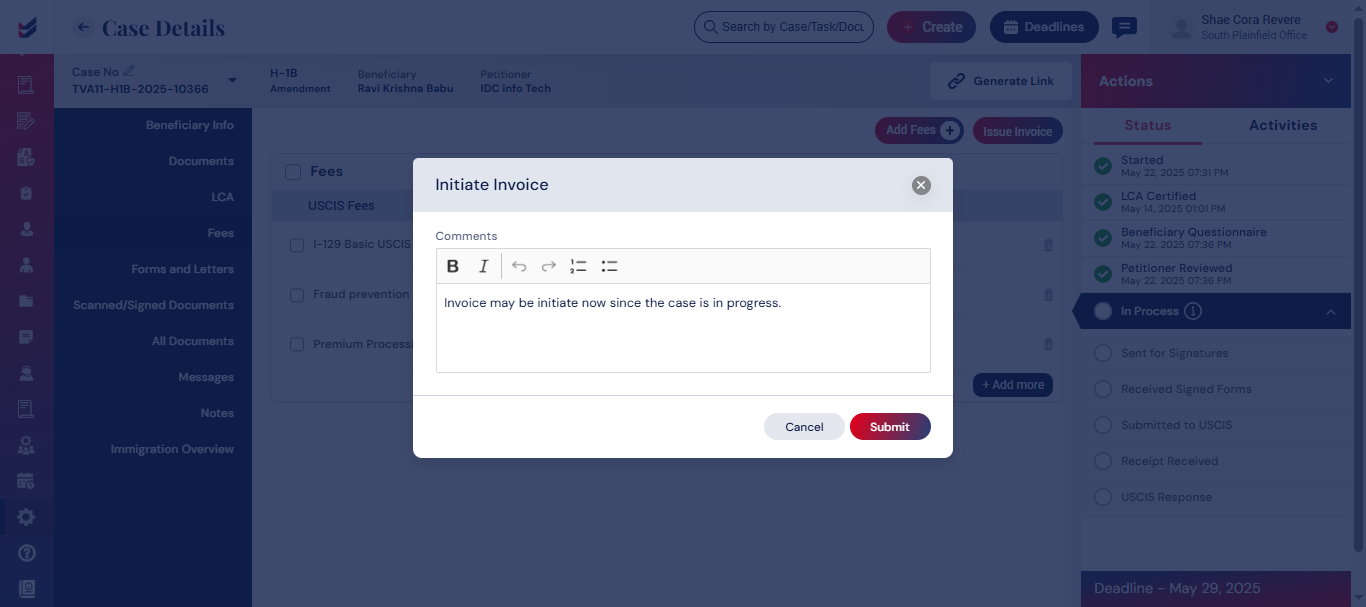 By clicking on the "Issue Invoice" button, the invoice will be generated, and an email will be sent to the Petitioner or the Beneficiary depending on the Case Type.