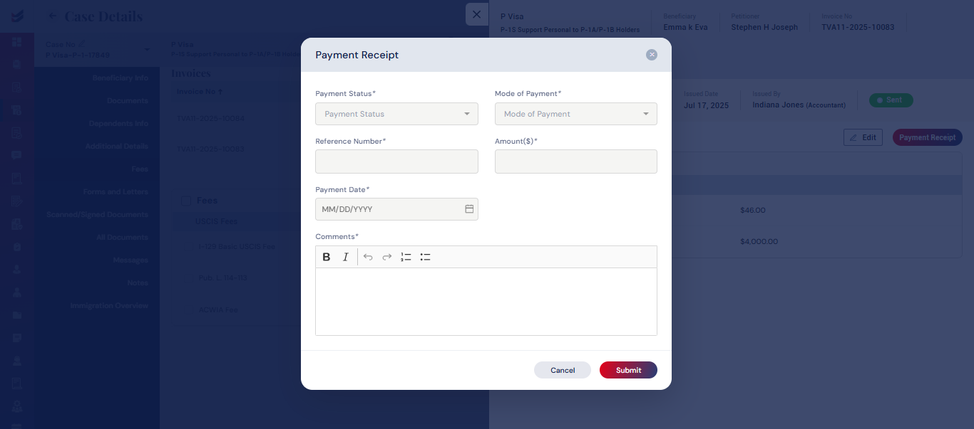 After the payment for the issued invoice has been completed, the invoice status can be modified by updating the Payment Receipt. The status may be changed to either Partially Paid or Fully Paid. This can be done within the case details by selecting the Details button and clicking on the Payment Receipt button. A pop-up will appear requesting the Payment Status, Mode of Payment, Reference Number, Amount, Payment Date, and Comments. Upon submission, the invoice status will be updated to either Partially Paid or Fully Paid.